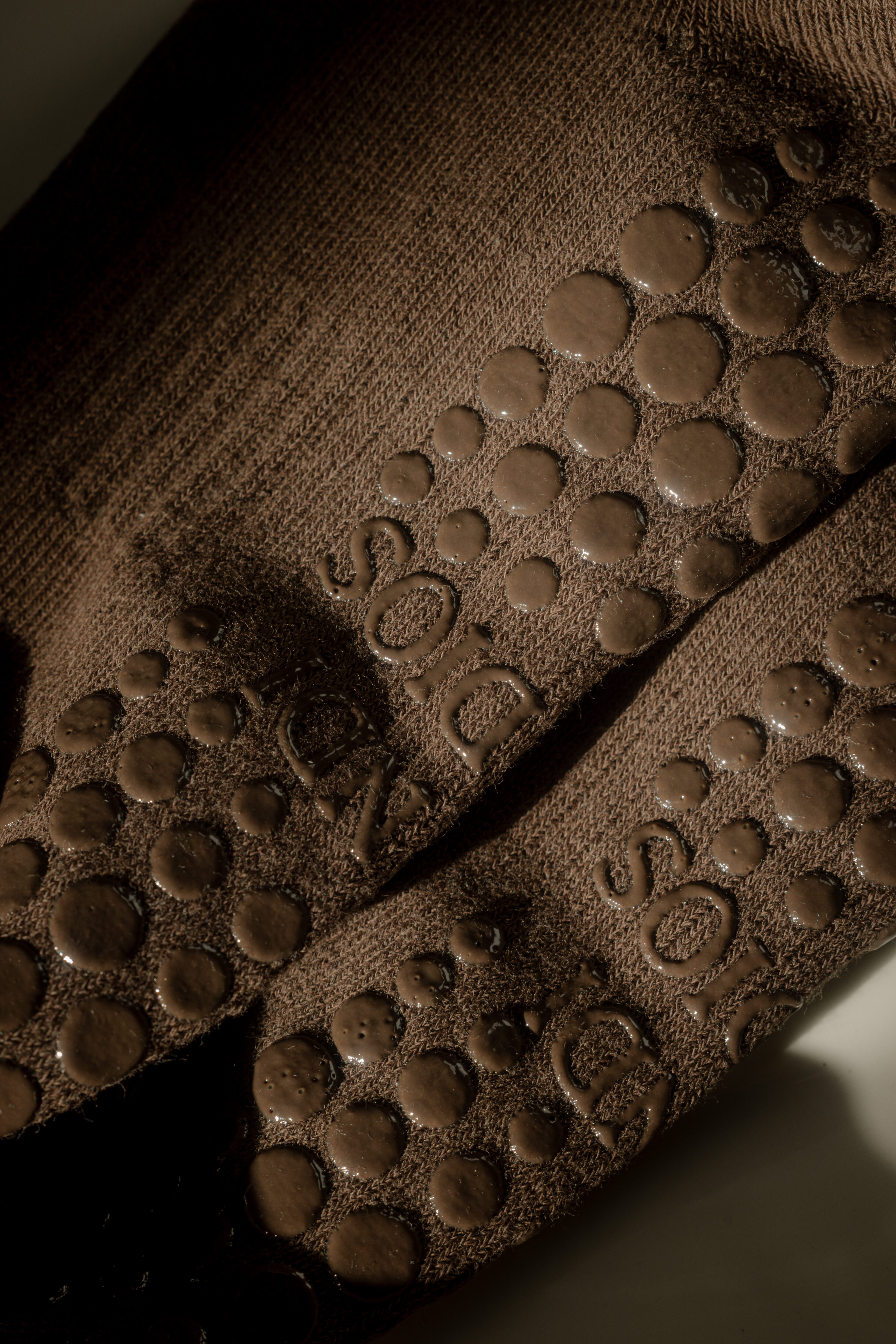 Meet your new studio essentials. Designed for movement, these grip socks keep you grounded through every flow. Soft, snug, they’re made to support your practice with just the right amount of grip and style. Brown sock with white text.
