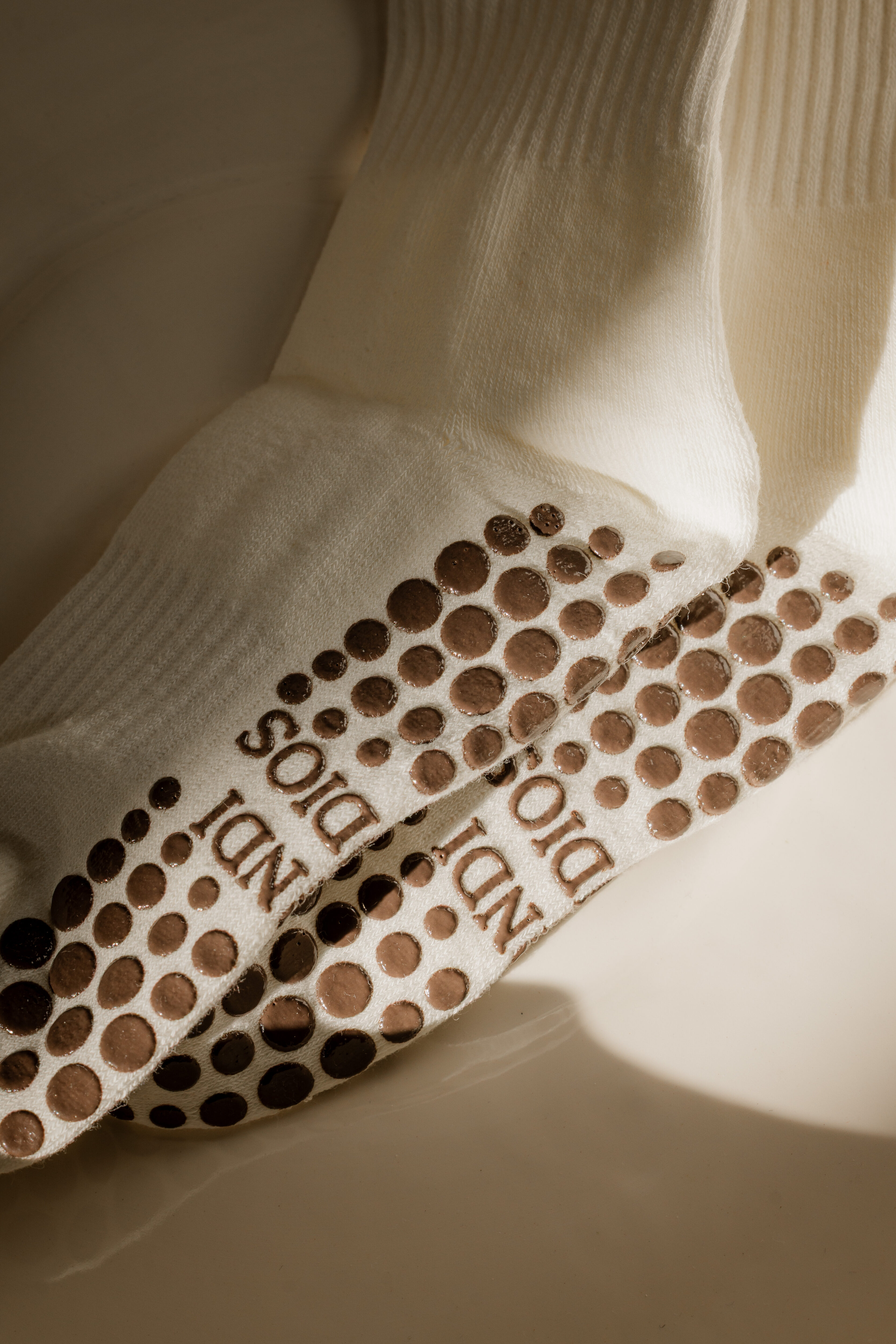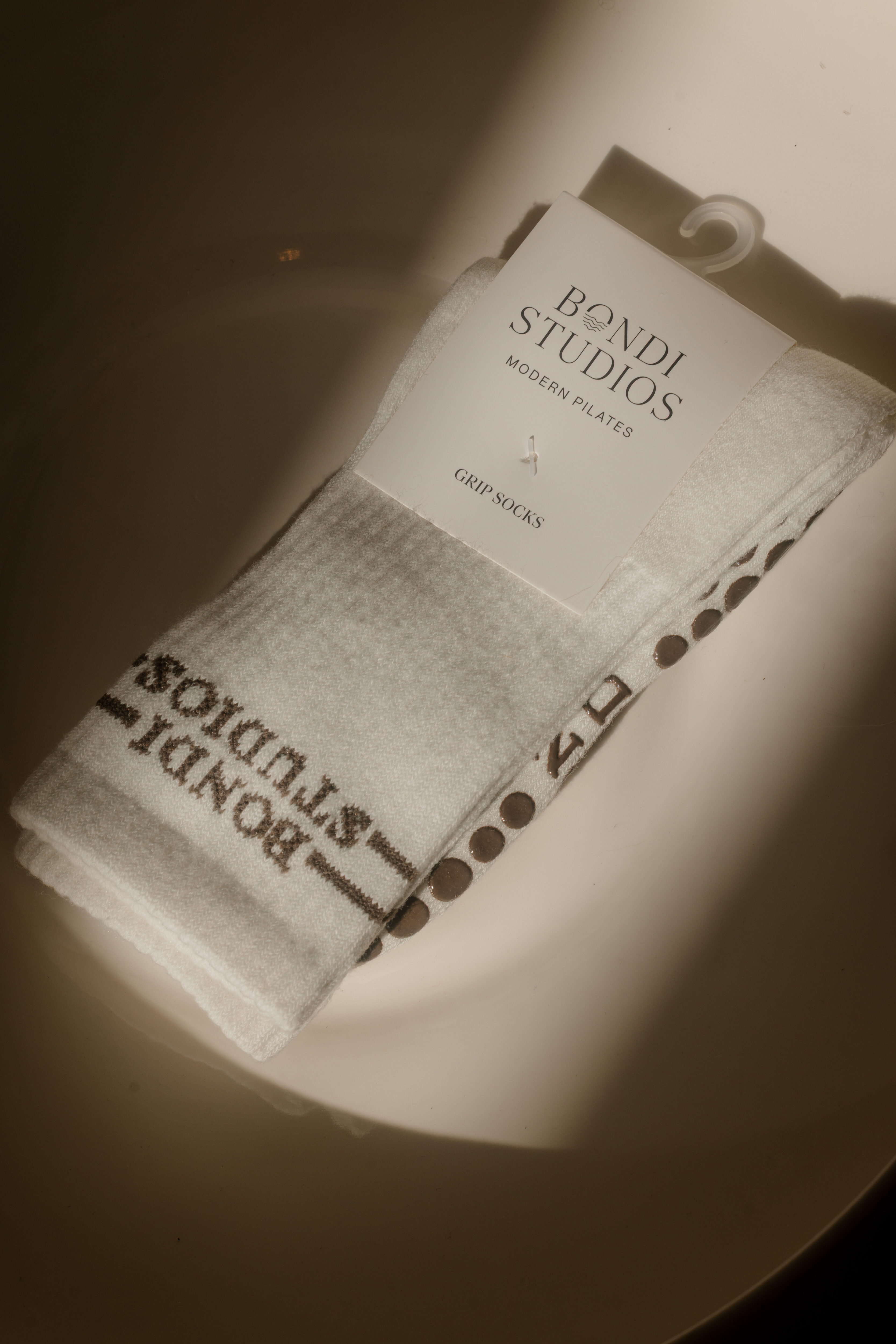 Meet your new studio essentials. Designed for movement, these grip socks keep you grounded through every flow. Soft, snug, they’re made to support your practice with just the right amount of grip and style. White sock with brown text.
